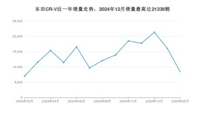 2025年2月,本田CR-V销量为8359辆,同比增长18.63%,环比下降48%。2024年02月-2025年02月份,本田CR-V销量为179746辆,同比下降18.77%。