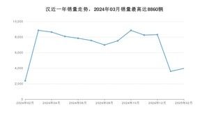 2025年2月,汉销量为3961辆,同比增长67.06%,环比增长10.64%。2024年02月-2025年02月份,汉销量为90771辆,同比下降33.99%。