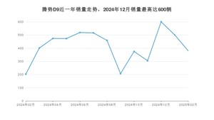 2025年2月,腾势D9销量为380辆,同比增长87.19%,环比下降24.15%。2024年02月-2025年02月份,腾势D9销量为5413辆,同比下降26.31%。