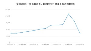 2025年2月,艾瑞泽8销量为6944辆,同比下降3.02%,环比下降57.12%。2024年02月-2025年02月份,艾瑞泽8销量为145566辆,同比增长46.33%。