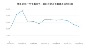 2025年2月,奥迪Q3销量为2344辆,同比增长4.41%,环比下降12.21%。2024年02月-2025年02月份,奥迪Q3销量为41898辆,同比下降23.73%。