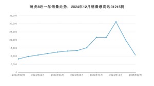 2025年2月,瑞虎8销量为10608辆,同比增长27.87%,环比下降46.82%。2024年02月-2025年02月份,瑞虎8销量为199574辆,同比增长32.47%。