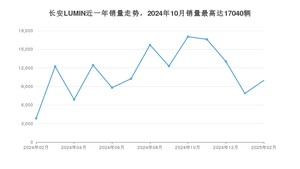 2025年2月,长安LUMIN销量为9970辆,同比增长159.3%,环比增长26.83%。2024年02月-2025年02月份,长安LUMIN销量为146932辆,同比下降3.3%。