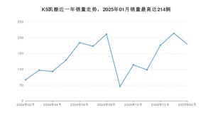 2025年2月,K5凯酷销量为179辆,同比增长167.16%,环比下降16.36%。2024年02月-2025年02月份,K5凯酷销量为1781辆,同比下降42.62%。