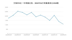 2025年2月,艾瑞泽5销量为1075辆,同比下降39.44%,环比下降22.72%。2024年02月-2025年02月份,艾瑞泽5销量为25357辆,同比下降43%。