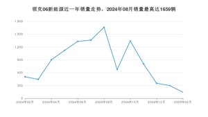 2025年2月,领克06新能源销量为143辆,同比下降71.57%,环比下降52.17%。2024年02月-2025年02月份,领克06新能源销量为10934辆,同比下降4.61%。