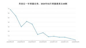2025年2月,昂扬销量为1辆,同比下降98.53%,环比下降75%。2024年02月-2025年02月份,昂扬销量为296辆,同比下降88.09%。