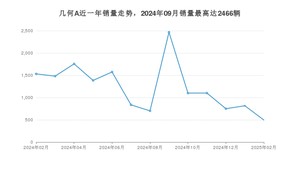 2025年2月,几何A销量为496辆,同比下降67.6%,环比下降39.22%。2024年02月-2025年02月份,几何A销量为15994辆,同比下降24.74%。