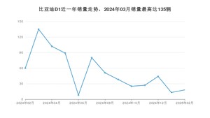2025年2月,比亚迪D1销量为18辆,同比下降70%,环比增长38.46%。2024年02月-2025年02月份,比亚迪D1销量为690辆,同比下降29.59%。