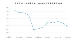 2025年2月,启辰大V销量为275辆,同比下降63.04%,环比下降25.07%。2024年02月-2025年02月份,启辰大V销量为5883辆,同比下降72.19%。