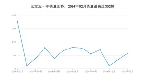 2025年2月,元宝销量为115辆,同比下降67.33%,环比增长64.29%。2024年02月-2025年02月份,元宝销量为1603辆,同比下降79.01%。