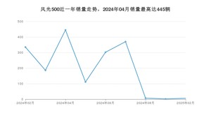 2025年2月,风光500销量为6辆,同比下降98.21%,环比增长200%。2024年02月-2025年02月份,风光500销量为1764辆,同比下降80.2%。
