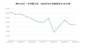 2025年5月,秦PLUS销量为10335辆,同比下降44.79%,环比下降1.21%。2024年05月-2025年05月份,秦PLUS销量为171612辆,同比下降13.73%。