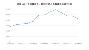 2025年5月,星越L销量为21014辆,同比增长47.67%,环比下降11.18%。2024年05月-2025年05月份,星越L销量为283859辆,同比增长44.08%。