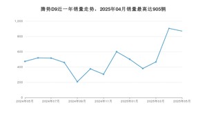 2025年5月,腾势D9销量为869辆,同比增长83.72%,环比下降3.98%。2024年05月-2025年05月份,腾势D9销量为6575辆,同比下降1.1%。