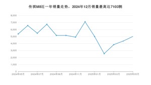 2025年5月,传祺M8销量为4999辆,同比下降6.77%,环比增长15.03%。2024年05月-2025年05月份,传祺M8销量为67146辆,同比下降19.44%。