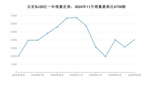 2025年5月,北京BJ30销量为4063辆,同比增长102.14%,环比增长30.81%。2024年05月-2025年05月份,北京BJ30销量为55766辆,同比增长1%。