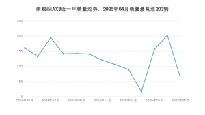 2025年5月,荣威iMAX8销量为63辆,同比下降60.87%,环比下降68.97%。2024年05月-2025年05月份,荣威iMAX8销量为1666辆,同比下降68.08%。