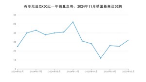 2025年5月,英菲尼迪QX50销量为32辆,同比增长28%,环比增长28%。2024年05月-2025年05月份,英菲尼迪QX50销量为433辆,同比下降73.14%。