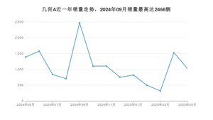 2025年5月,几何A销量为1027辆,同比下降25.85%,环比下降32.79%。2024年05月-2025年05月份,几何A销量为14095辆,同比下降22.16%。