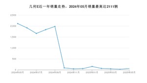 2025年5月,几何E销量为60辆,同比下降97.16%,环比增长122.22%。2024年05月-2025年05月份,几何E销量为10033辆,同比下降72.58%。