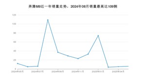 2025年5月,奔腾M9销量为6辆,同比下降50%,环比增长20%。2024年05月-2025年05月份,奔腾M9销量为343辆,同比下降67.18%。