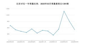 2025年5月,北京X7销量为500辆,同比下降29.08%,环比下降44.51%。2024年05月-2025年05月份,北京X7销量为7373辆,同比下降26.39%。