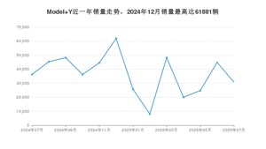2025年7月,Model Y销量为30766辆,同比下降15.24%,环比下降31.4%。2024年07月-2025年07月份,Model Y销量为474749辆,同比下降4.4%。