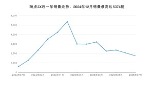 2025年7月,瑞虎3X销量为1744辆,同比增长184.5%,环比下降14.97%。2024年07月-2025年07月份,瑞虎3X销量为34953辆,同比增长137.19%。