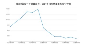 2025年7月,启辰D60销量为142辆,同比下降82.79%,环比下降37.99%。2024年07月-2025年07月份,启辰D60销量为10561辆,同比增长91.63%。