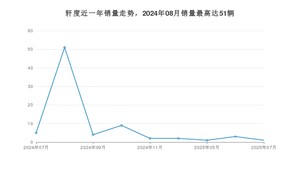 2025年7月,轩度销量为1辆,同比下降80%,环比下降66.67%。2024年07月-2025年07月份,轩度销量为78辆,同比下降88.65%。